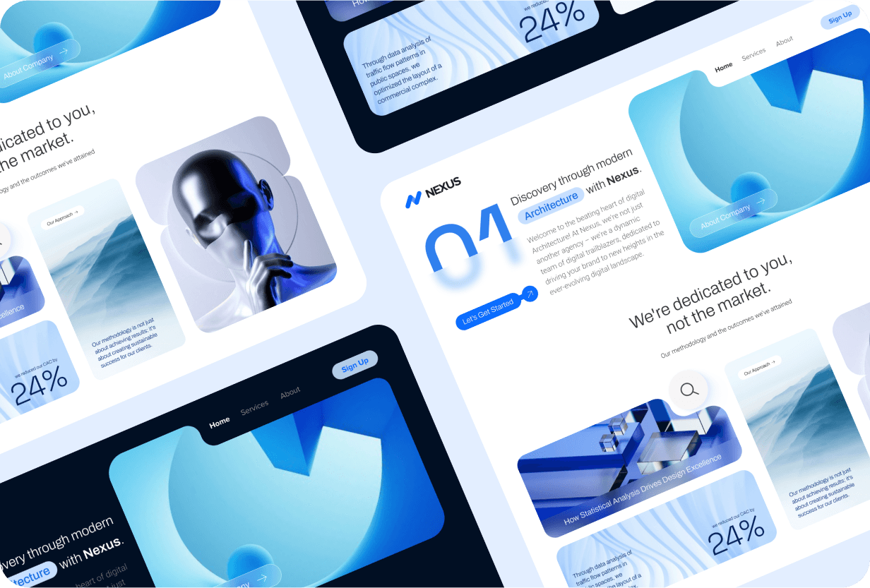 Color Palette: The blue and white color scheme was selected to convey professionalism, trust, and clarity, aligning with the agency’s architectural expertise. The white background provides a clean, minimalistic feel, allowing the blue accents to guide users’ attention to important areas like the navigation menu, headings, and calls-to-action (CTAs).